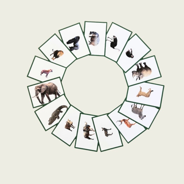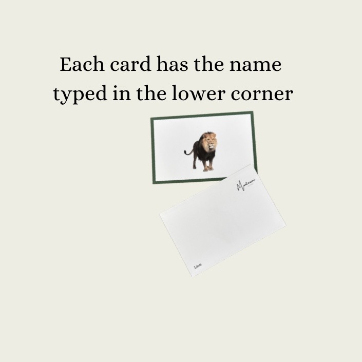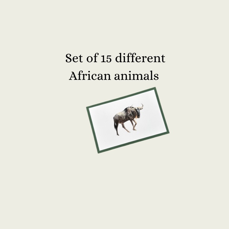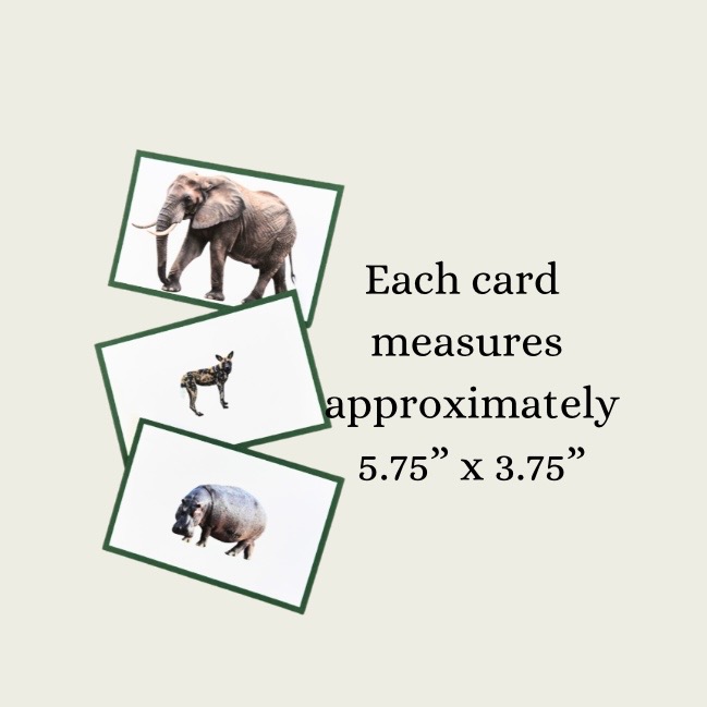 This toddler-sized language card set features 15 different African animals, they are built to last with sturdy 10-mil lamination and rounded corners. Â Each card features a clear image with the name printed on the back for consistency among adults. Â Skip the hours of researching, formatting, cutting, and laminating – this ready-to-use set saves you time and instantly elevates your language area.