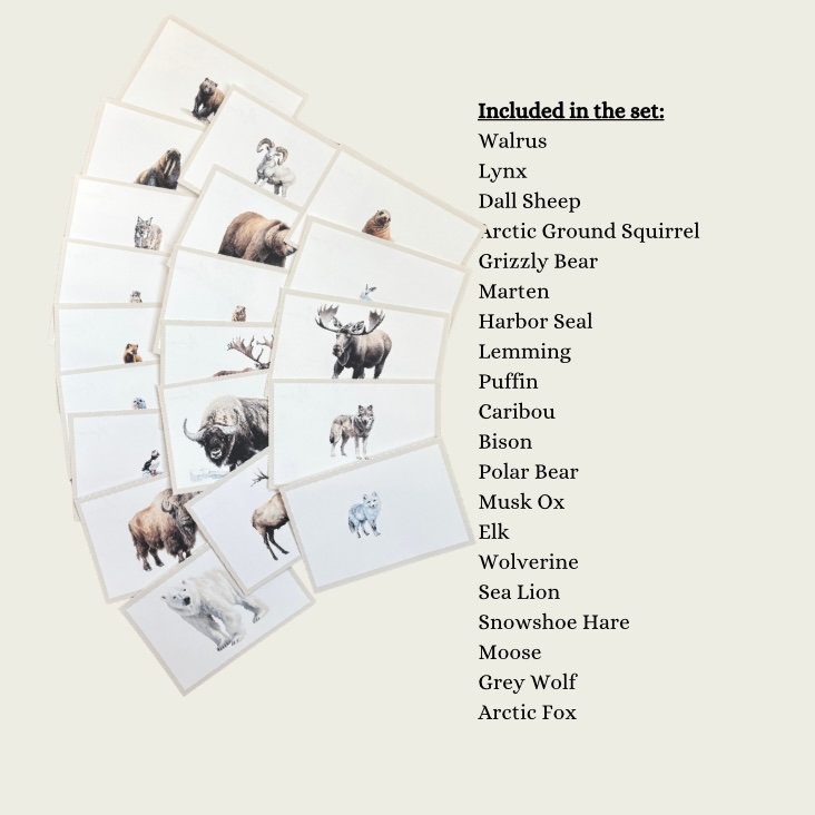 Included in this set: Walrus, Lynx, Dall Sheep, Arctic Ground Squirrel, Grizzly Bear, Marten, Harbor Seal, Lemming, Puffin, Caribou, Bison, Polar Bear, Musk Ox, Elk, Wolverine, Sea Lion, Snowshoe Hare, Moose, Grey Wolf, Arctic Fox