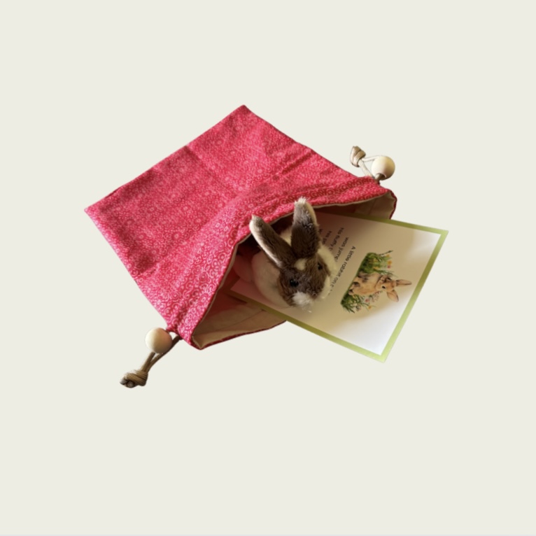 This charming, handcrafted drawstring bag, measuring approximately 9.5″ tall be 9″ wide – with beaded, knotted ends – holds a delightful surprise: a soft finger puppet of a rabbit and a song card to go with it. Â Designed to be pulled out in moments of high energy; it’s a simple yet powerful tool for gently redirecting the group’s focus and bringing the room back to calm.