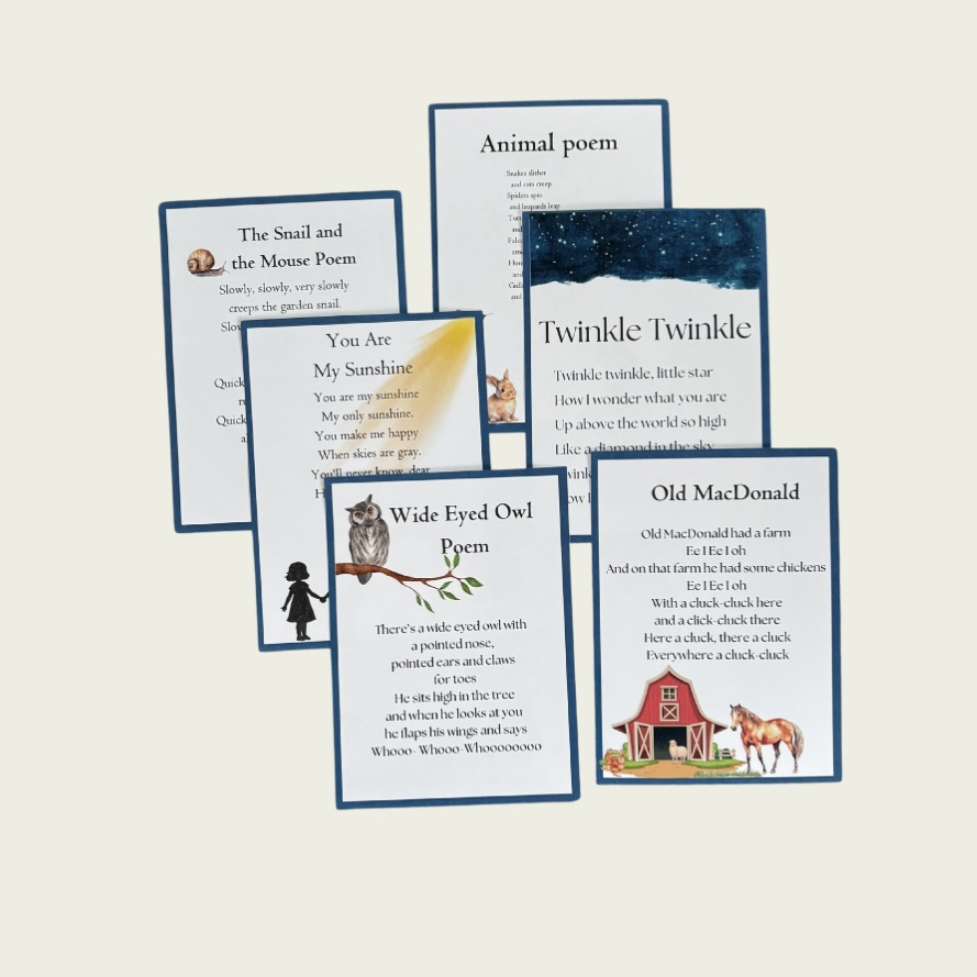 This set of six Song and Poem Cards encourages independent use. Toddlers recognize the song by the image, while the printed lyrics help adults support this work. This includes familiar favorites, a few new songs, and short poems to build rhythm and language through joyful repetition. This set includes: Old MacDonald, Wide Eyed Owl Poem, You Are My Sunshine, The Snail & the Mouse Poem, Twinkle-Twinkle, Animal Poem