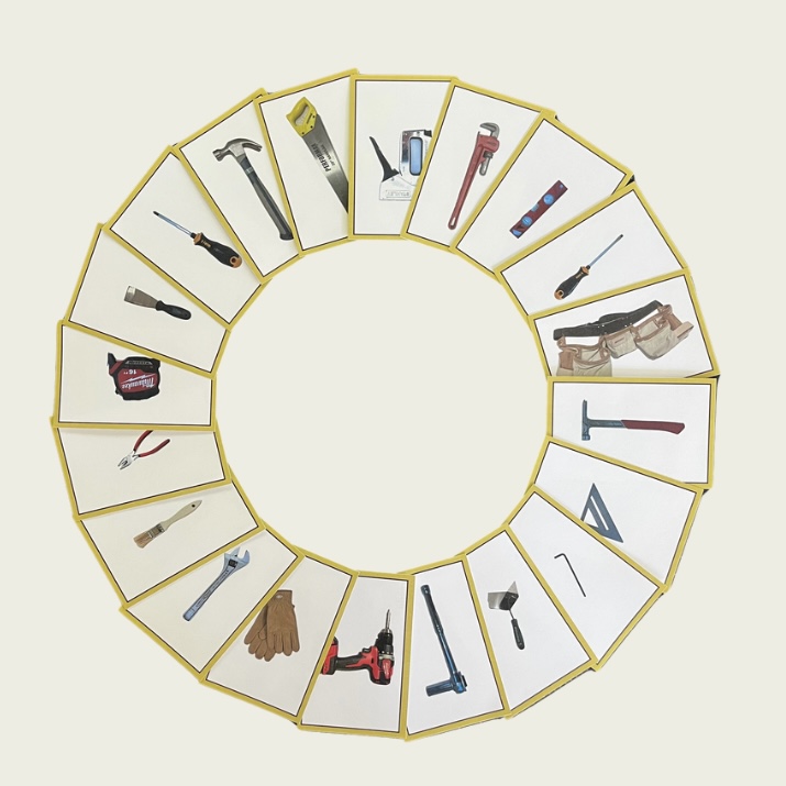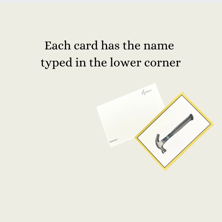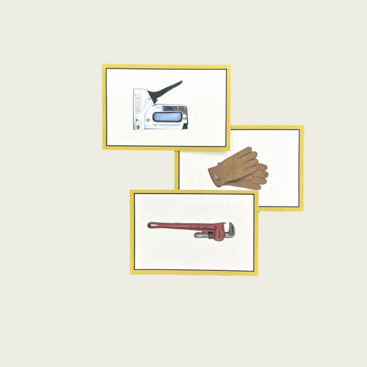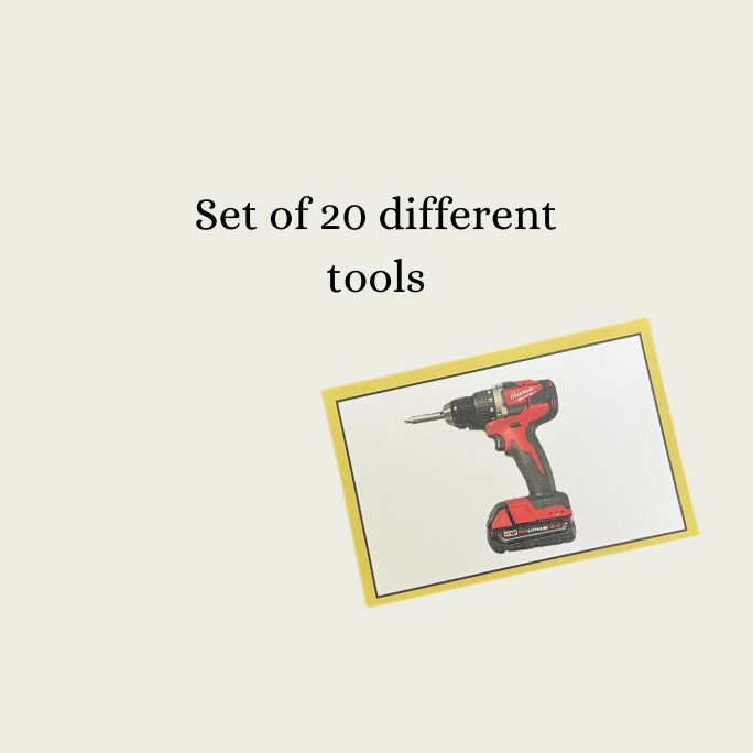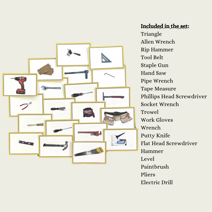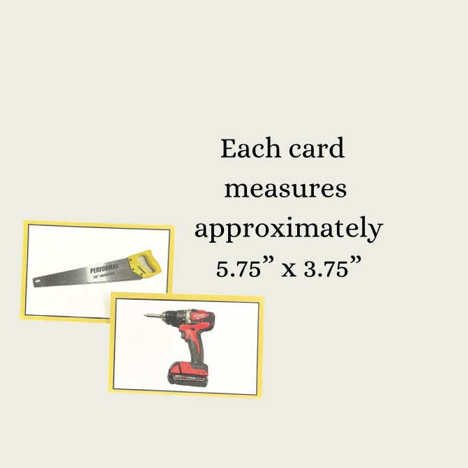 This toddler-sized language card set features 20 tools and is built to last with sturdy 10-mil lamination and rounded corners. Â Each card features a clear image with the name printed on the back for consistency among adults. Â Skip the hours of researching, formatting, cutting, and laminating – this ready-to-use set saves you time and instantly elevates your language area.