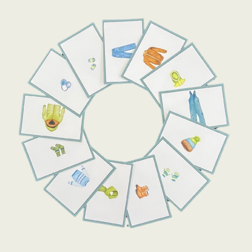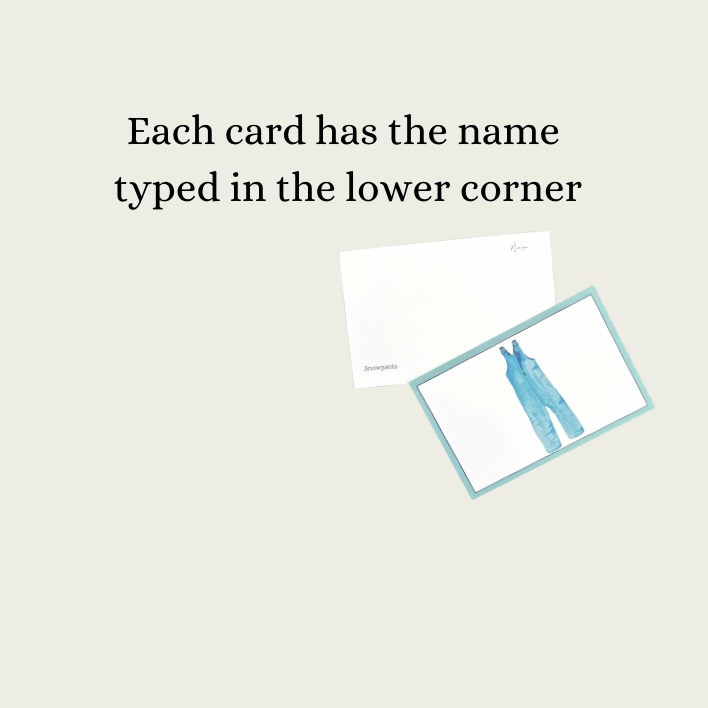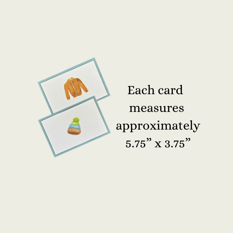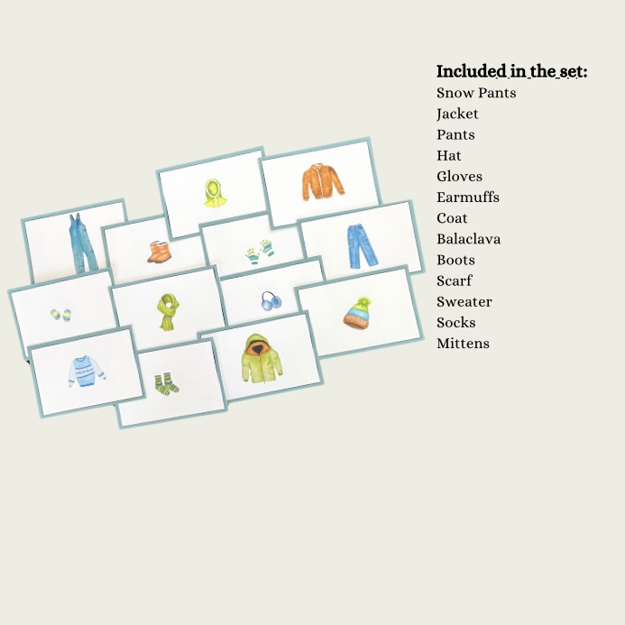 This toddler-sized language card set features 13 pieces of winter gear and is built to last with sturdy 10-mil lamination and rounded corners. Â Each card features a clear image with the name printed on the back for consistency among adults. Â Skip the hours of researching, formatting, cutting, and laminating – this ready-to-use set saves you time and instantly elevates your language area.