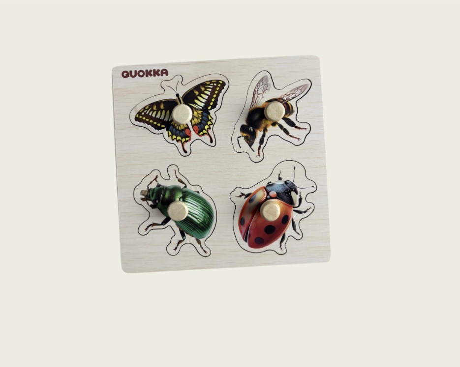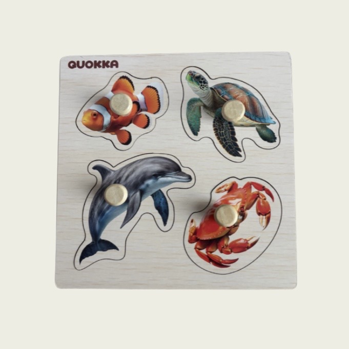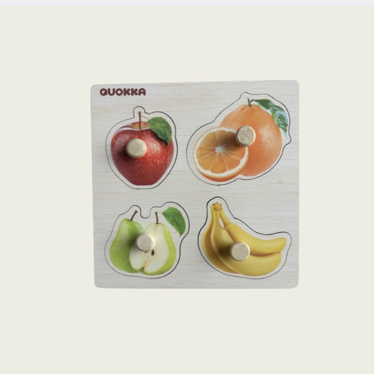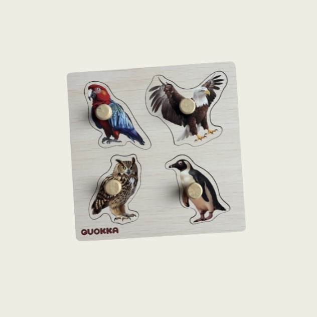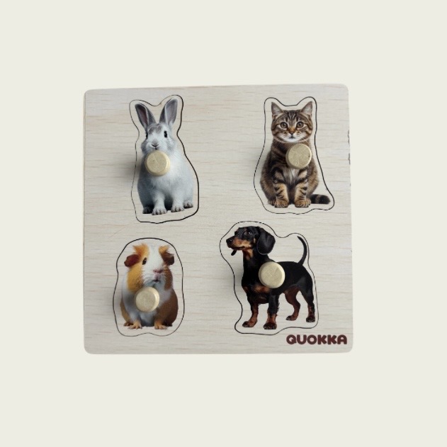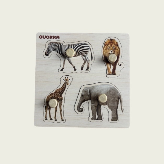 This wooden knobbed puzzle features a sturdy 6×6 square frame with four realistic objects. The simple format of four images per puzzle offers a clean, uncluttered presentation that supports focus, vocabulary development and refinement of hand muscles.