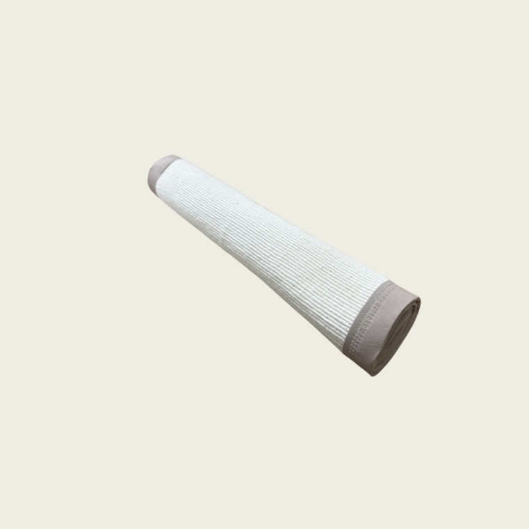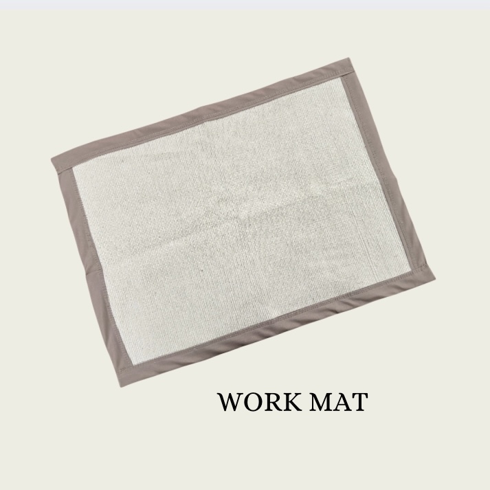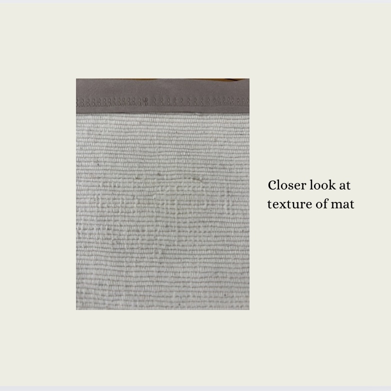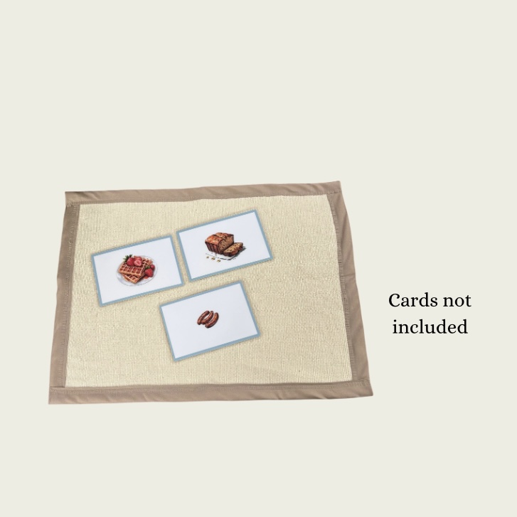 This woven cotton work mat is edged with a neutral 1″ binding for durability and a defined visual border.  Measuring ROUGHLY 19″ wide by 14.5″ tall, the slightly thinner cotton weave makes it easier for young Montessori children to roll successfully, while the edging provides both a visual frame and just enough stiffness to support neat rolling.